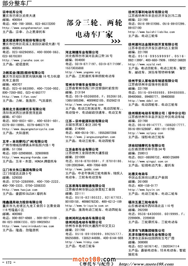 這兩年行業(yè)調(diào)整力度非常大,為了確保我們提供的信息準(zhǔn)確性,我們本著寧缺毋濫的原則,不去圖虛的數(shù)量。目前摩托車與配件行業(yè)的不少經(jīng)銷商是跨行業(yè)經(jīng)營的,所以我們在本書中增加了部分摩托車整車廠、電動車生產(chǎn)廠、機動三輪車制造廠。所選的這些企業(yè)都是這個行業(yè)具有影響力的品牌企業(yè),是為了大家在使用這本書時,獲取相關(guān)的延伸產(chǎn)業(yè)更多的實用信息。