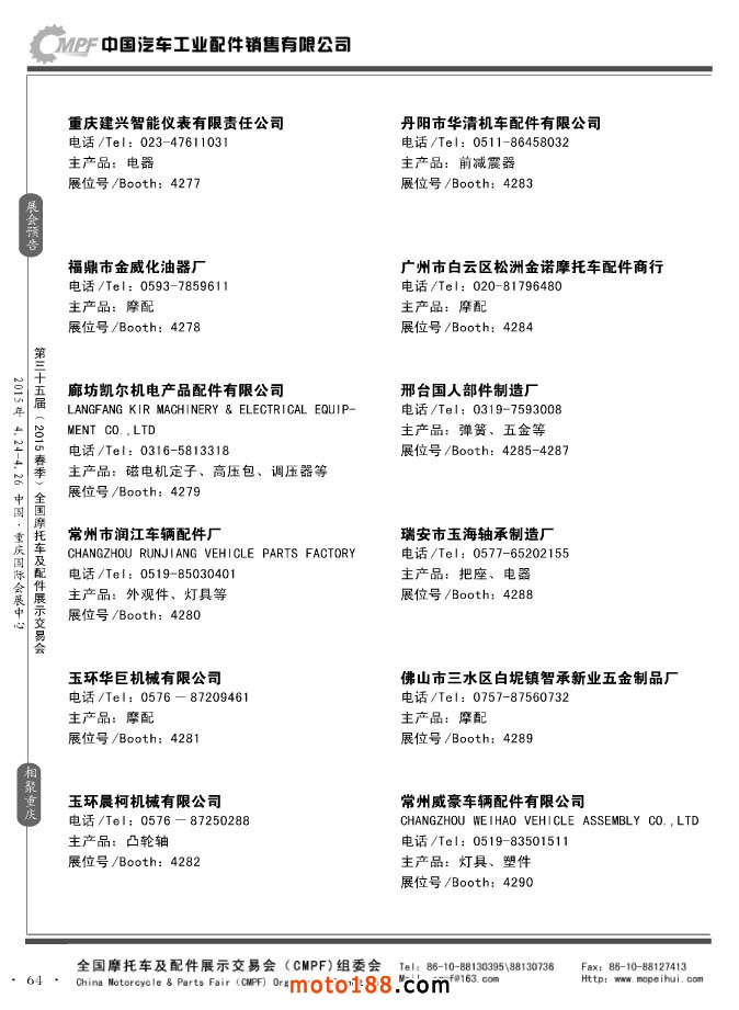 ”全國摩托車及配件展示會“(CMPF)是中國摩托車行業(yè)的傳統(tǒng)盛會,自1981年至今已成功舉辦了67季次(每年春、秋季各舉辦一次),現(xiàn)已發(fā)展成為行業(yè)內規(guī)模最大、專業(yè)觀眾最多、影響最廣泛、參展商最有收獲的全國性品牌展會。CMPF展會聚集了全國大部分摩托車配件生產企業(yè)與流通企業(yè),是產需雙方進行貿易洽談、新產品技術推廣與交流的理想服務平臺。