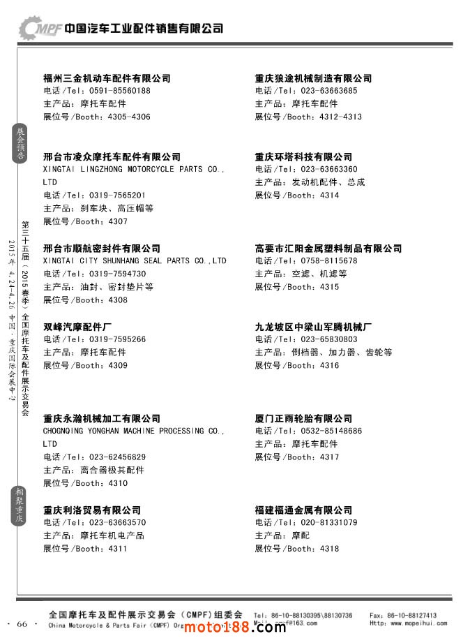 ”全國摩托車及配件展示會“(CMPF)是中國摩托車行業(yè)的傳統(tǒng)盛會,自1981年至今已成功舉辦了67季次(每年春、秋季各舉辦一次),現(xiàn)已發(fā)展成為行業(yè)內(nèi)規(guī)模最大、專業(yè)觀眾最多、影響最廣泛、參展商最有收獲的全國性品牌展會。CMPF展會聚集了全國大部分摩托車配件生產(chǎn)企業(yè)與流通企業(yè),是產(chǎn)需雙方進行貿(mào)易洽談、新產(chǎn)品技術(shù)推廣與交流的理想服務(wù)平臺。