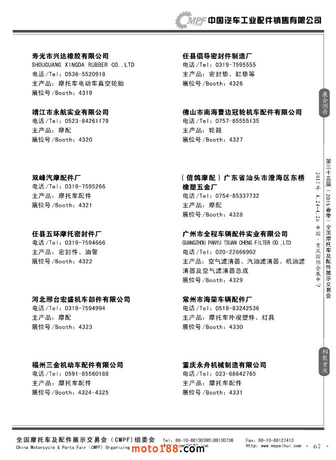 ”全國摩托車及配件展示會“(CMPF)是中國摩托車行業(yè)的傳統(tǒng)盛會,自1981年至今已成功舉辦了67季次(每年春、秋季各舉辦一次),現(xiàn)已發(fā)展成為行業(yè)內(nèi)規(guī)模最大、專業(yè)觀眾最多、影響最廣泛、參展商最有收獲的全國性品牌展會。CMPF展會聚集了全國大部分摩托車配件生產(chǎn)企業(yè)與流通企業(yè),是產(chǎn)需雙方進行貿(mào)易洽談、新產(chǎn)品技術(shù)推廣與交流的理想服務(wù)平臺。