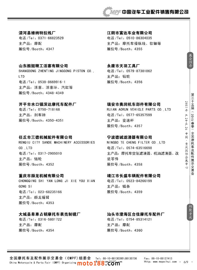 ”全國摩托車及配件展示會“(CMPF)是中國摩托車行業(yè)的傳統(tǒng)盛會,自1981年至今已成功舉辦了67季次(每年春、秋季各舉辦一次),現(xiàn)已發(fā)展成為行業(yè)內(nèi)規(guī)模最大、專業(yè)觀眾最多、影響最廣泛、參展商最有收獲的全國性品牌展會。CMPF展會聚集了全國大部分摩托車配件生產(chǎn)企業(yè)與流通企業(yè),是產(chǎn)需雙方進(jìn)行貿(mào)易洽談、新產(chǎn)品技術(shù)推廣與交流的理想服務(wù)平臺。