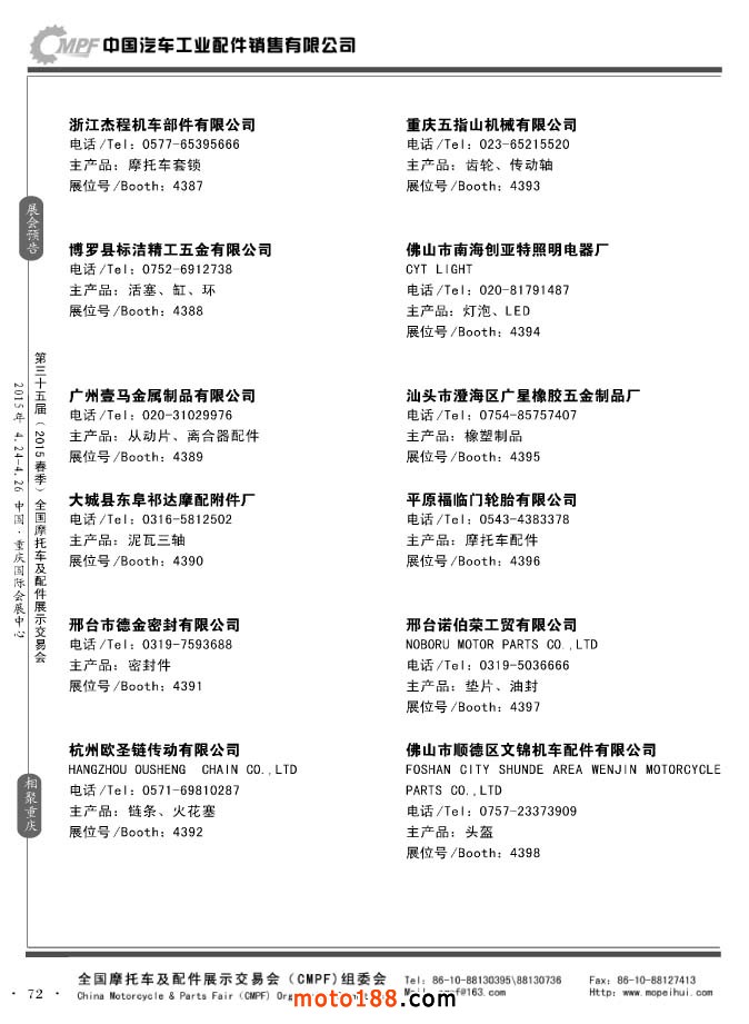 ”全國(guó)摩托車及配件展示會(huì)“(CMPF)是中國(guó)摩托車行業(yè)的傳統(tǒng)盛會(huì),自1981年至今已成功舉辦了67季次(每年春、秋季各舉辦一次),現(xiàn)已發(fā)展成為行業(yè)內(nèi)規(guī)模最大、專業(yè)觀眾最多、影響最廣泛、參展商最有收獲的全國(guó)性品牌展會(huì)。CMPF展會(huì)聚集了全國(guó)大部分摩托車配件生產(chǎn)企業(yè)與流通企業(yè),是產(chǎn)需雙方進(jìn)行貿(mào)易洽談、新產(chǎn)品技術(shù)推廣與交流的理想服務(wù)平臺(tái)。