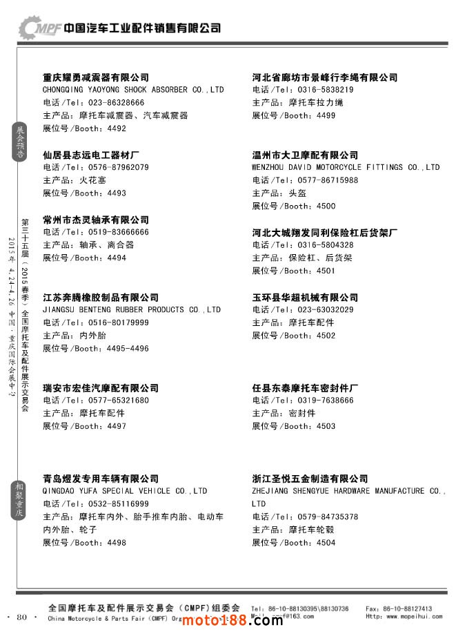 ”全國摩托車及配件展示會“(CMPF)是中國摩托車行業(yè)的傳統(tǒng)盛會,自1981年至今已成功舉辦了67季次(每年春、秋季各舉辦一次),現(xiàn)已發(fā)展成為行業(yè)內(nèi)規(guī)模最大、專業(yè)觀眾最多、影響最廣泛、參展商最有收獲的全國性品牌展會。CMPF展會聚集了全國大部分摩托車配件生產(chǎn)企業(yè)與流通企業(yè),是產(chǎn)需雙方進(jìn)行貿(mào)易洽談、新產(chǎn)品技術(shù)推廣與交流的理想服務(wù)平臺。