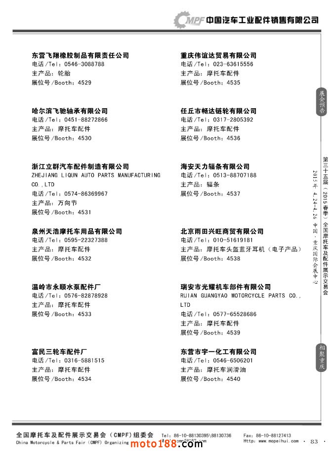 ”全國摩托車及配件展示會“(CMPF)是中國摩托車行業(yè)的傳統(tǒng)盛會,自1981年至今已成功舉辦了67季次(每年春、秋季各舉辦一次),現(xiàn)已發(fā)展成為行業(yè)內(nèi)規(guī)模最大、專業(yè)觀眾最多、影響最廣泛、參展商最有收獲的全國性品牌展會。CMPF展會聚集了全國大部分摩托車配件生產(chǎn)企業(yè)與流通企業(yè),是產(chǎn)需雙方進行貿(mào)易洽談、新產(chǎn)品技術(shù)推廣與交流的理想服務平臺。