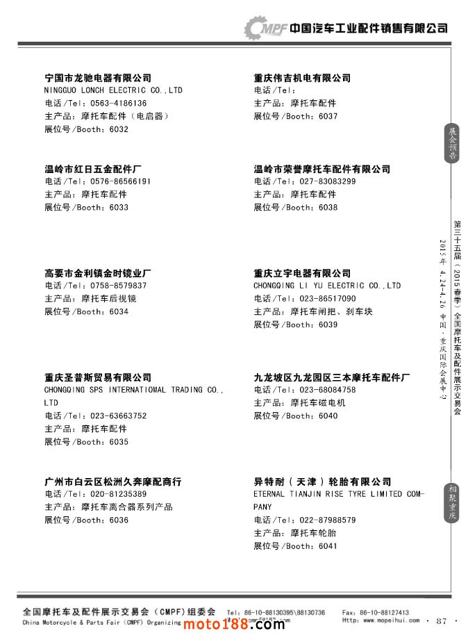 ”全國摩托車及配件展示會“(CMPF)是中國摩托車行業(yè)的傳統(tǒng)盛會,自1981年至今已成功舉辦了67季次(每年春、秋季各舉辦一次),現(xiàn)已發(fā)展成為行業(yè)內(nèi)規(guī)模最大、專業(yè)觀眾最多、影響最廣泛、參展商最有收獲的全國性品牌展會。CMPF展會聚集了全國大部分摩托車配件生產(chǎn)企業(yè)與流通企業(yè),是產(chǎn)需雙方進行貿(mào)易洽談、新產(chǎn)品技術(shù)推廣與交流的理想服務(wù)平臺。