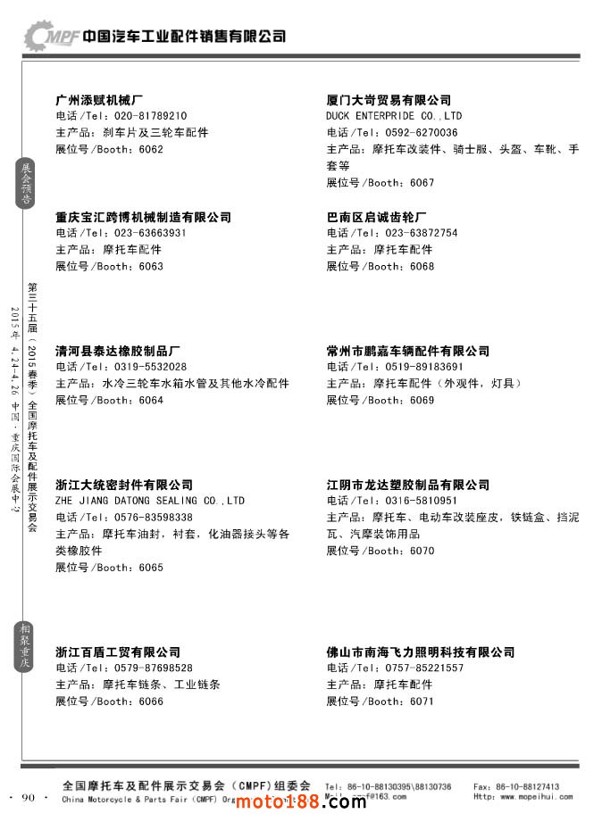 ”全國(guó)摩托車及配件展示會(huì)“(CMPF)是中國(guó)摩托車行業(yè)的傳統(tǒng)盛會(huì),自1981年至今已成功舉辦了67季次(每年春、秋季各舉辦一次),現(xiàn)已發(fā)展成為行業(yè)內(nèi)規(guī)模最大、專業(yè)觀眾最多、影響最廣泛、參展商最有收獲的全國(guó)性品牌展會(huì)。CMPF展會(huì)聚集了全國(guó)大部分摩托車配件生產(chǎn)企業(yè)與流通企業(yè),是產(chǎn)需雙方進(jìn)行貿(mào)易洽談、新產(chǎn)品技術(shù)推廣與交流的理想服務(wù)平臺(tái)。