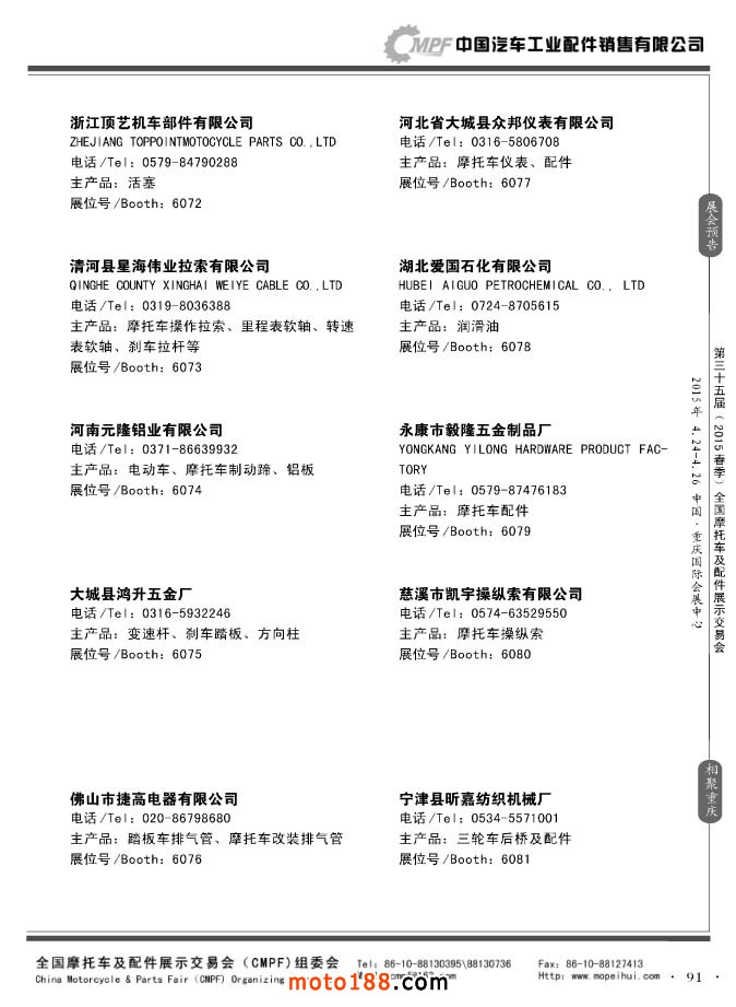 ”全國摩托車及配件展示會“(CMPF)是中國摩托車行業(yè)的傳統(tǒng)盛會,自1981年至今已成功舉辦了67季次(每年春、秋季各舉辦一次),現(xiàn)已發(fā)展成為行業(yè)內(nèi)規(guī)模最大、專業(yè)觀眾最多、影響最廣泛、參展商最有收獲的全國性品牌展會。CMPF展會聚集了全國大部分摩托車配件生產(chǎn)企業(yè)與流通企業(yè),是產(chǎn)需雙方進(jìn)行貿(mào)易洽談、新產(chǎn)品技術(shù)推廣與交流的理想服務(wù)平臺。