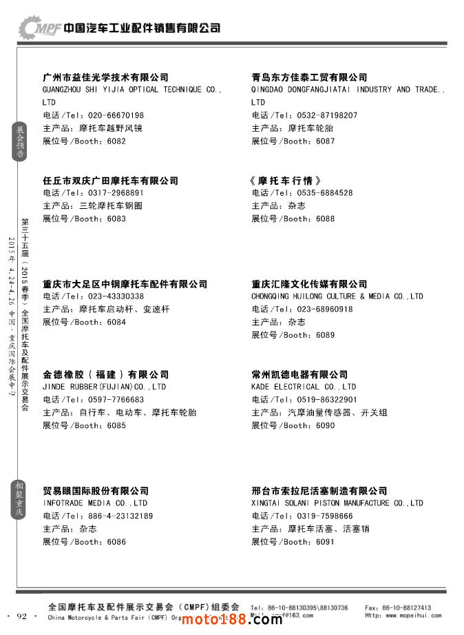 ”全國(guó)摩托車(chē)及配件展示會(huì)“(CMPF)是中國(guó)摩托車(chē)行業(yè)的傳統(tǒng)盛會(huì),自1981年至今已成功舉辦了67季次(每年春、秋季各舉辦一次),現(xiàn)已發(fā)展成為行業(yè)內(nèi)規(guī)模最大、專(zhuān)業(yè)觀眾最多、影響最廣泛、參展商最有收獲的全國(guó)性品牌展會(huì)。CMPF展會(huì)聚集了全國(guó)大部分摩托車(chē)配件生產(chǎn)企業(yè)與流通企業(yè),是產(chǎn)需雙方進(jìn)行貿(mào)易洽談、新產(chǎn)品技術(shù)推廣與交流的理想服務(wù)平臺(tái)。