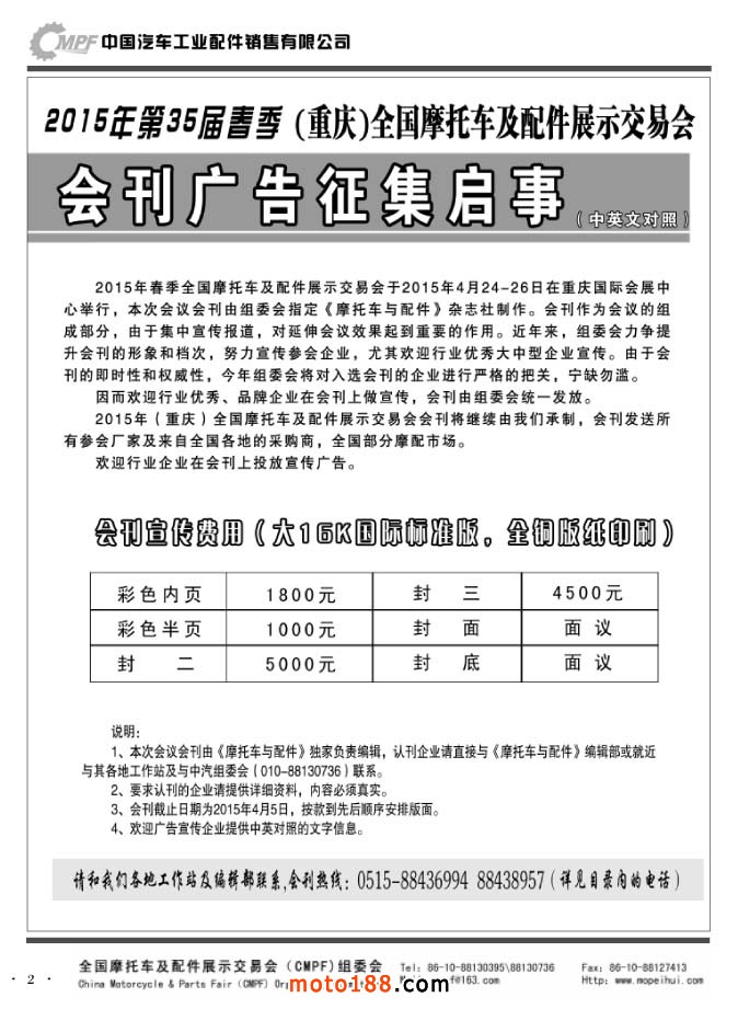”全國摩托車及配件展示會“(CMPF)是中國摩托車行業(yè)的傳統(tǒng)盛會,自1981年至今已成功舉辦了67季次(每年春、秋季各舉辦一次),現(xiàn)已發(fā)展成為行業(yè)內(nèi)規(guī)模最大、專業(yè)觀眾最多、影響最廣泛、參展商最有收獲的全國性品牌展會。CMPF展會聚集了全國大部分摩托車配件生產(chǎn)企業(yè)與流通企業(yè),是產(chǎn)需雙方進行貿(mào)易洽談、新產(chǎn)品技術(shù)推廣與交流的理想服務平臺。