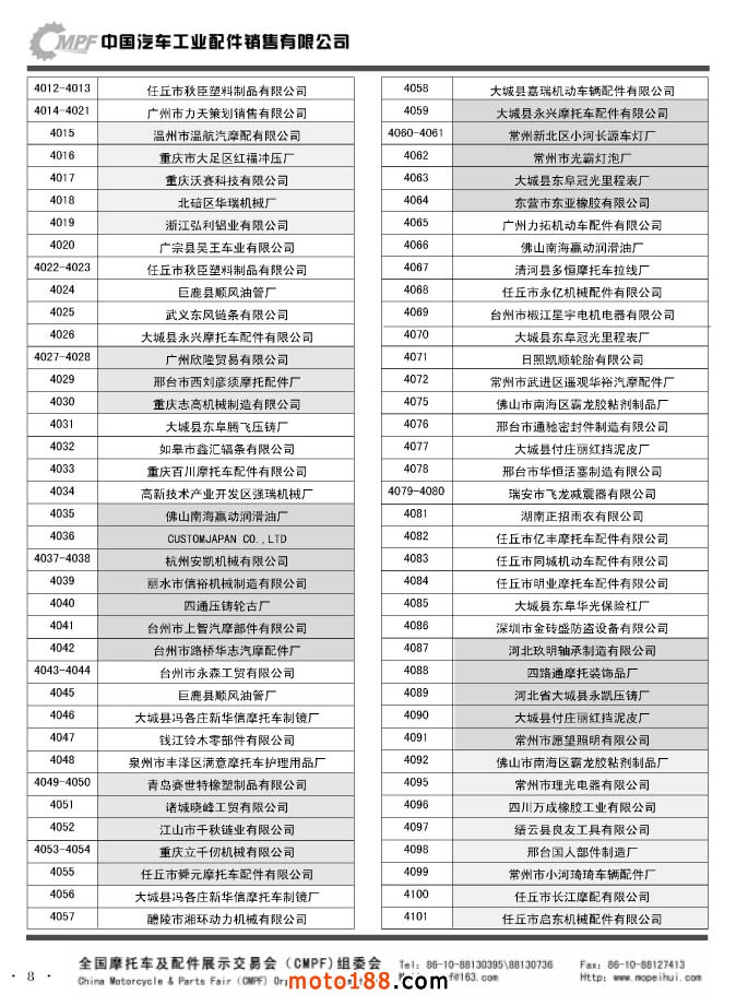 ”全國摩托車及配件展示會“(CMPF)是中國摩托車行業(yè)的傳統(tǒng)盛會,自1981年至今已成功舉辦了67季次(每年春、秋季各舉辦一次),現(xiàn)已發(fā)展成為行業(yè)內規(guī)模最大、專業(yè)觀眾最多、影響最廣泛、參展商最有收獲的全國性品牌展會。CMPF展會聚集了全國大部分摩托車配件生產企業(yè)與流通企業(yè),是產需雙方進行貿易洽談、新產品技術推廣與交流的理想服務平臺。