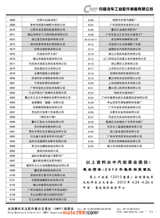 ”全國摩托車及配件展示會“(CMPF)是中國摩托車行業(yè)的傳統(tǒng)盛會,自1981年至今已成功舉辦了67季次(每年春、秋季各舉辦一次),現(xiàn)已發(fā)展成為行業(yè)內(nèi)規(guī)模最大、專業(yè)觀眾最多、影響最廣泛、參展商最有收獲的全國性品牌展會。CMPF展會聚集了全國大部分摩托車配件生產(chǎn)企業(yè)與流通企業(yè),是產(chǎn)需雙方進行貿(mào)易洽談、新產(chǎn)品技術(shù)推廣與交流的理想服務(wù)平臺。
