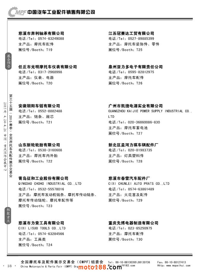 ”全國(guó)摩托車及配件展示會(huì)“(CMPF)是中國(guó)摩托車行業(yè)的傳統(tǒng)盛會(huì),自1981年至今已成功舉辦了67季次(每年春、秋季各舉辦一次),現(xiàn)已發(fā)展成為行業(yè)內(nèi)規(guī)模最大、專業(yè)觀眾最多、影響最廣泛、參展商最有收獲的全國(guó)性品牌展會(huì)。CMPF展會(huì)聚集了全國(guó)大部分摩托車配件生產(chǎn)企業(yè)與流通企業(yè),是產(chǎn)需雙方進(jìn)行貿(mào)易洽談、新產(chǎn)品技術(shù)推廣與交流的理想服務(wù)平臺(tái)。