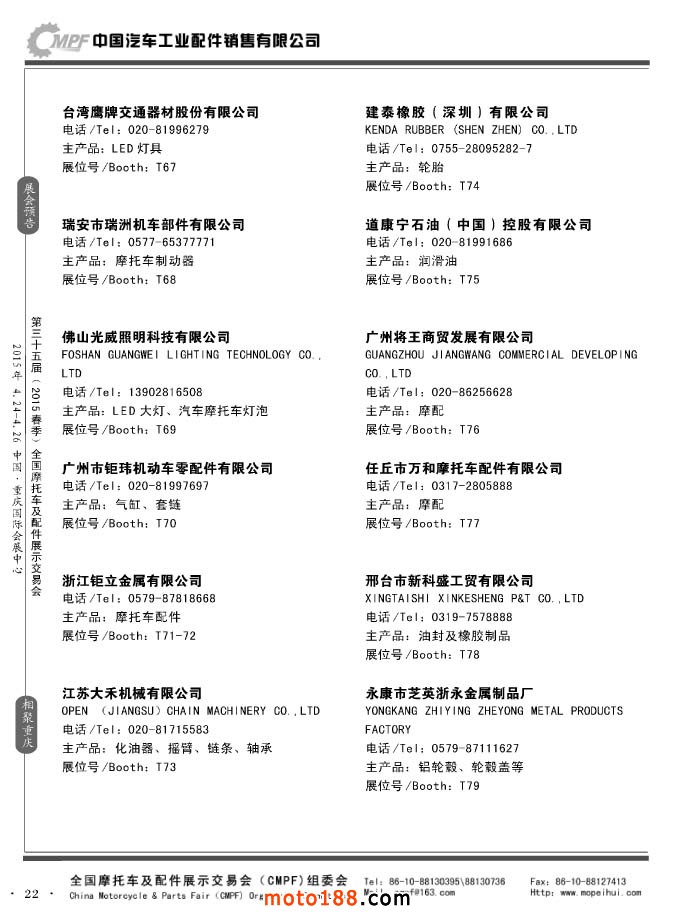 ”全國摩托車及配件展示會(huì)“(CMPF)是中國摩托車行業(yè)的傳統(tǒng)盛會(huì),自1981年至今已成功舉辦了67季次(每年春、秋季各舉辦一次),現(xiàn)已發(fā)展成為行業(yè)內(nèi)規(guī)模最大、專業(yè)觀眾最多、影響最廣泛、參展商最有收獲的全國性品牌展會(huì)。CMPF展會(huì)聚集了全國大部分摩托車配件生產(chǎn)企業(yè)與流通企業(yè),是產(chǎn)需雙方進(jìn)行貿(mào)易洽談、新產(chǎn)品技術(shù)推廣與交流的理想服務(wù)平臺(tái)。