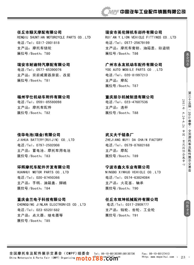 ”全國摩托車及配件展示會“(CMPF)是中國摩托車行業(yè)的傳統(tǒng)盛會,自1981年至今已成功舉辦了67季次(每年春、秋季各舉辦一次),現(xiàn)已發(fā)展成為行業(yè)內(nèi)規(guī)模最大、專業(yè)觀眾最多、影響最廣泛、參展商最有收獲的全國性品牌展會。CMPF展會聚集了全國大部分摩托車配件生產(chǎn)企業(yè)與流通企業(yè),是產(chǎn)需雙方進(jìn)行貿(mào)易洽談、新產(chǎn)品技術(shù)推廣與交流的理想服務(wù)平臺。