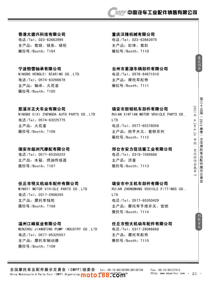 ”全國摩托車及配件展示會“(CMPF)是中國摩托車行業(yè)的傳統(tǒng)盛會,自1981年至今已成功舉辦了67季次(每年春、秋季各舉辦一次),現(xiàn)已發(fā)展成為行業(yè)內(nèi)規(guī)模最大、專業(yè)觀眾最多、影響最廣泛、參展商最有收獲的全國性品牌展會。CMPF展會聚集了全國大部分摩托車配件生產(chǎn)企業(yè)與流通企業(yè),是產(chǎn)需雙方進(jìn)行貿(mào)易洽談、新產(chǎn)品技術(shù)推廣與交流的理想服務(wù)平臺。