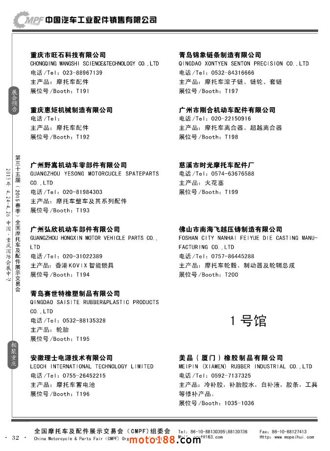 ”全國(guó)摩托車(chē)及配件展示會(huì)“(CMPF)是中國(guó)摩托車(chē)行業(yè)的傳統(tǒng)盛會(huì),自1981年至今已成功舉辦了67季次(每年春、秋季各舉辦一次),現(xiàn)已發(fā)展成為行業(yè)內(nèi)規(guī)模最大、專(zhuān)業(yè)觀眾最多、影響最廣泛、參展商最有收獲的全國(guó)性品牌展會(huì)。CMPF展會(huì)聚集了全國(guó)大部分摩托車(chē)配件生產(chǎn)企業(yè)與流通企業(yè),是產(chǎn)需雙方進(jìn)行貿(mào)易洽談、新產(chǎn)品技術(shù)推廣與交流的理想服務(wù)平臺(tái)。