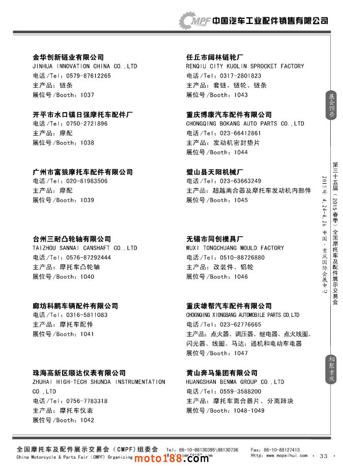 ”全國(guó)摩托車(chē)及配件展示會(huì)“(CMPF)是中國(guó)摩托車(chē)行業(yè)的傳統(tǒng)盛會(huì),自1981年至今已成功舉辦了67季次(每年春、秋季各舉辦一次),現(xiàn)已發(fā)展成為行業(yè)內(nèi)規(guī)模最大、專業(yè)觀眾最多、影響最廣泛、參展商最有收獲的全國(guó)性品牌展會(huì)。CMPF展會(huì)聚集了全國(guó)大部分摩托車(chē)配件生產(chǎn)企業(yè)與流通企業(yè),是產(chǎn)需雙方進(jìn)行貿(mào)易洽談、新產(chǎn)品技術(shù)推廣與交流的理想服務(wù)平臺(tái)。
