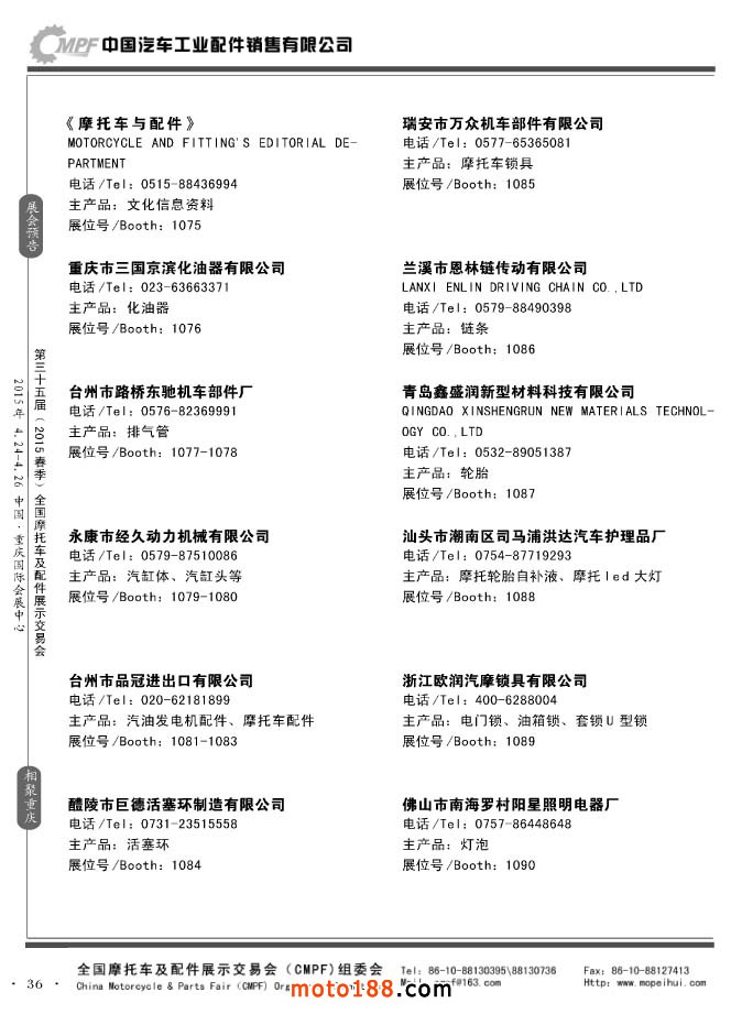 ”全國(guó)摩托車及配件展示會(huì)“(CMPF)是中國(guó)摩托車行業(yè)的傳統(tǒng)盛會(huì),自1981年至今已成功舉辦了67季次(每年春、秋季各舉辦一次),現(xiàn)已發(fā)展成為行業(yè)內(nèi)規(guī)模最大、專業(yè)觀眾最多、影響最廣泛、參展商最有收獲的全國(guó)性品牌展會(huì)。CMPF展會(huì)聚集了全國(guó)大部分摩托車配件生產(chǎn)企業(yè)與流通企業(yè),是產(chǎn)需雙方進(jìn)行貿(mào)易洽談、新產(chǎn)品技術(shù)推廣與交流的理想服務(wù)平臺(tái)。