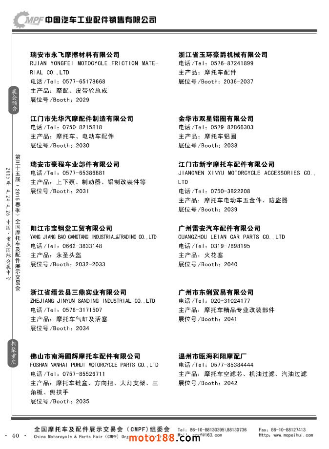 ”全國(guó)摩托車及配件展示會(huì)“(CMPF)是中國(guó)摩托車行業(yè)的傳統(tǒng)盛會(huì),自1981年至今已成功舉辦了67季次(每年春、秋季各舉辦一次),現(xiàn)已發(fā)展成為行業(yè)內(nèi)規(guī)模最大、專業(yè)觀眾最多、影響最廣泛、參展商最有收獲的全國(guó)性品牌展會(huì)。CMPF展會(huì)聚集了全國(guó)大部分摩托車配件生產(chǎn)企業(yè)與流通企業(yè),是產(chǎn)需雙方進(jìn)行貿(mào)易洽談、新產(chǎn)品技術(shù)推廣與交流的理想服務(wù)平臺(tái)。