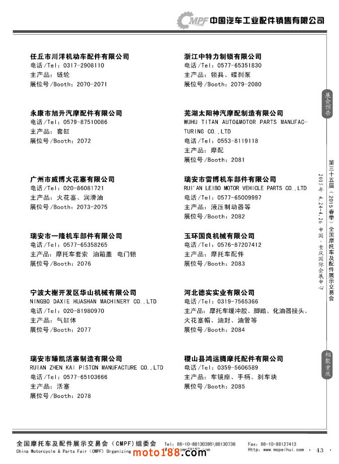 ”全國摩托車及配件展示會(huì)“(CMPF)是中國摩托車行業(yè)的傳統(tǒng)盛會(huì),自1981年至今已成功舉辦了67季次(每年春、秋季各舉辦一次),現(xiàn)已發(fā)展成為行業(yè)內(nèi)規(guī)模最大、專業(yè)觀眾最多、影響最廣泛、參展商最有收獲的全國性品牌展會(huì)。CMPF展會(huì)聚集了全國大部分摩托車配件生產(chǎn)企業(yè)與流通企業(yè),是產(chǎn)需雙方進(jìn)行貿(mào)易洽談、新產(chǎn)品技術(shù)推廣與交流的理想服務(wù)平臺(tái)。