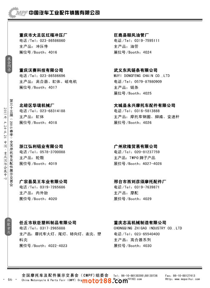 ”全國摩托車及配件展示會(huì)“(CMPF)是中國摩托車行業(yè)的傳統(tǒng)盛會(huì),自1981年至今已成功舉辦了67季次(每年春、秋季各舉辦一次),現(xiàn)已發(fā)展成為行業(yè)內(nèi)規(guī)模最大、專業(yè)觀眾最多、影響最廣泛、參展商最有收獲的全國性品牌展會(huì)。CMPF展會(huì)聚集了全國大部分摩托車配件生產(chǎn)企業(yè)與流通企業(yè),是產(chǎn)需雙方進(jìn)行貿(mào)易洽談、新產(chǎn)品技術(shù)推廣與交流的理想服務(wù)平臺(tái)。