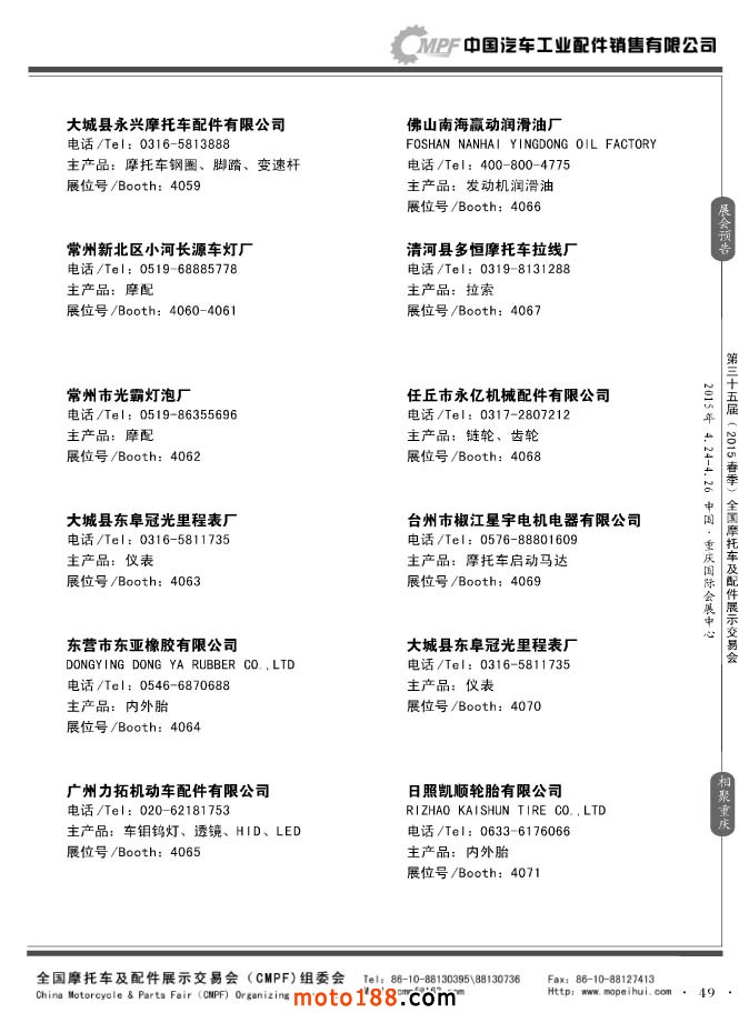 ”全國(guó)摩托車及配件展示會(huì)“(CMPF)是中國(guó)摩托車行業(yè)的傳統(tǒng)盛會(huì),自1981年至今已成功舉辦了67季次(每年春、秋季各舉辦一次),現(xiàn)已發(fā)展成為行業(yè)內(nèi)規(guī)模最大、專業(yè)觀眾最多、影響最廣泛、參展商最有收獲的全國(guó)性品牌展會(huì)。CMPF展會(huì)聚集了全國(guó)大部分摩托車配件生產(chǎn)企業(yè)與流通企業(yè),是產(chǎn)需雙方進(jìn)行貿(mào)易洽談、新產(chǎn)品技術(shù)推廣與交流的理想服務(wù)平臺(tái)。