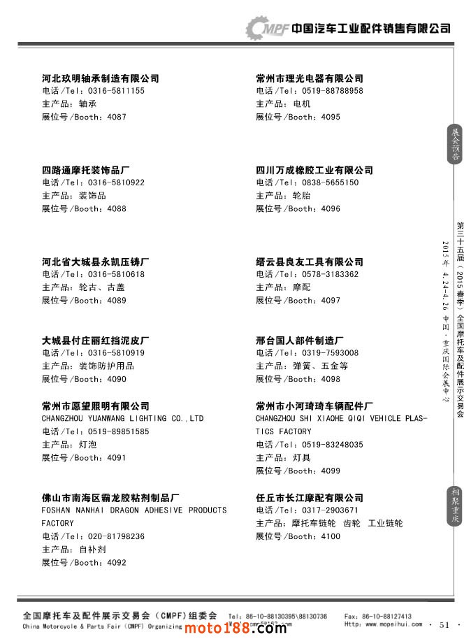 ”全國(guó)摩托車及配件展示會(huì)“(CMPF)是中國(guó)摩托車行業(yè)的傳統(tǒng)盛會(huì),自1981年至今已成功舉辦了67季次(每年春、秋季各舉辦一次),現(xiàn)已發(fā)展成為行業(yè)內(nèi)規(guī)模最大、專業(yè)觀眾最多、影響最廣泛、參展商最有收獲的全國(guó)性品牌展會(huì)。CMPF展會(huì)聚集了全國(guó)大部分摩托車配件生產(chǎn)企業(yè)與流通企業(yè),是產(chǎn)需雙方進(jìn)行貿(mào)易洽談、新產(chǎn)品技術(shù)推廣與交流的理想服務(wù)平臺(tái)。