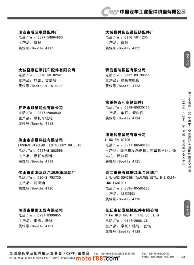 ”全國摩托車及配件展示會“(CMPF)是中國摩托車行業(yè)的傳統(tǒng)盛會,自1981年至今已成功舉辦了67季次(每年春、秋季各舉辦一次),現(xiàn)已發(fā)展成為行業(yè)內(nèi)規(guī)模最大、專業(yè)觀眾最多、影響最廣泛、參展商最有收獲的全國性品牌展會。CMPF展會聚集了全國大部分摩托車配件生產(chǎn)企業(yè)與流通企業(yè),是產(chǎn)需雙方進行貿(mào)易洽談、新產(chǎn)品技術(shù)推廣與交流的理想服務(wù)平臺。