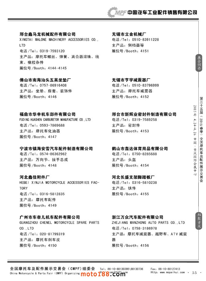 ”全國摩托車及配件展示會(huì)“(CMPF)是中國摩托車行業(yè)的傳統(tǒng)盛會(huì),自1981年至今已成功舉辦了67季次(每年春、秋季各舉辦一次),現(xiàn)已發(fā)展成為行業(yè)內(nèi)規(guī)模最大、專業(yè)觀眾最多、影響最廣泛、參展商最有收獲的全國性品牌展會(huì)。CMPF展會(huì)聚集了全國大部分摩托車配件生產(chǎn)企業(yè)與流通企業(yè),是產(chǎn)需雙方進(jìn)行貿(mào)易洽談、新產(chǎn)品技術(shù)推廣與交流的理想服務(wù)平臺(tái)。