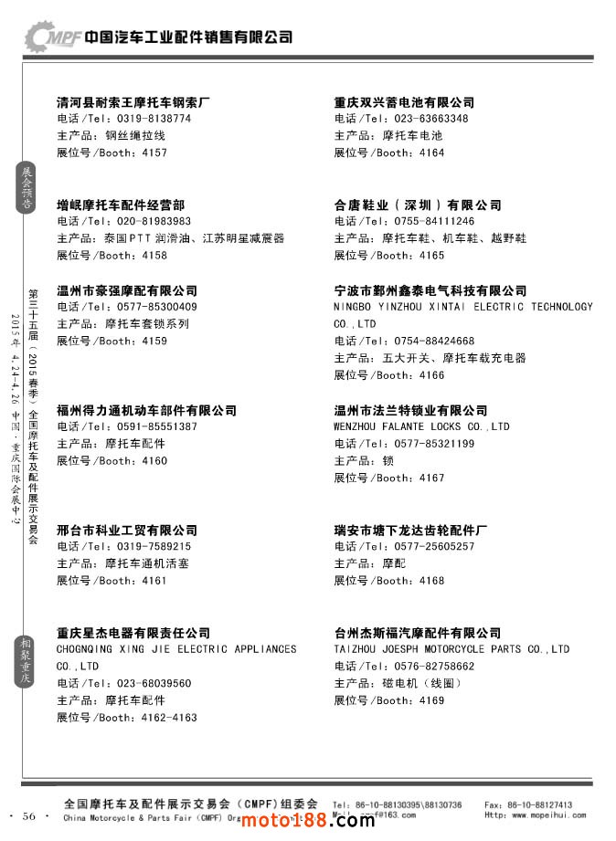 ”全國摩托車及配件展示會(huì)“(CMPF)是中國摩托車行業(yè)的傳統(tǒng)盛會(huì),自1981年至今已成功舉辦了67季次(每年春、秋季各舉辦一次),現(xiàn)已發(fā)展成為行業(yè)內(nèi)規(guī)模最大、專業(yè)觀眾最多、影響最廣泛、參展商最有收獲的全國性品牌展會(huì)。CMPF展會(huì)聚集了全國大部分摩托車配件生產(chǎn)企業(yè)與流通企業(yè),是產(chǎn)需雙方進(jìn)行貿(mào)易洽談、新產(chǎn)品技術(shù)推廣與交流的理想服務(wù)平臺(tái)。