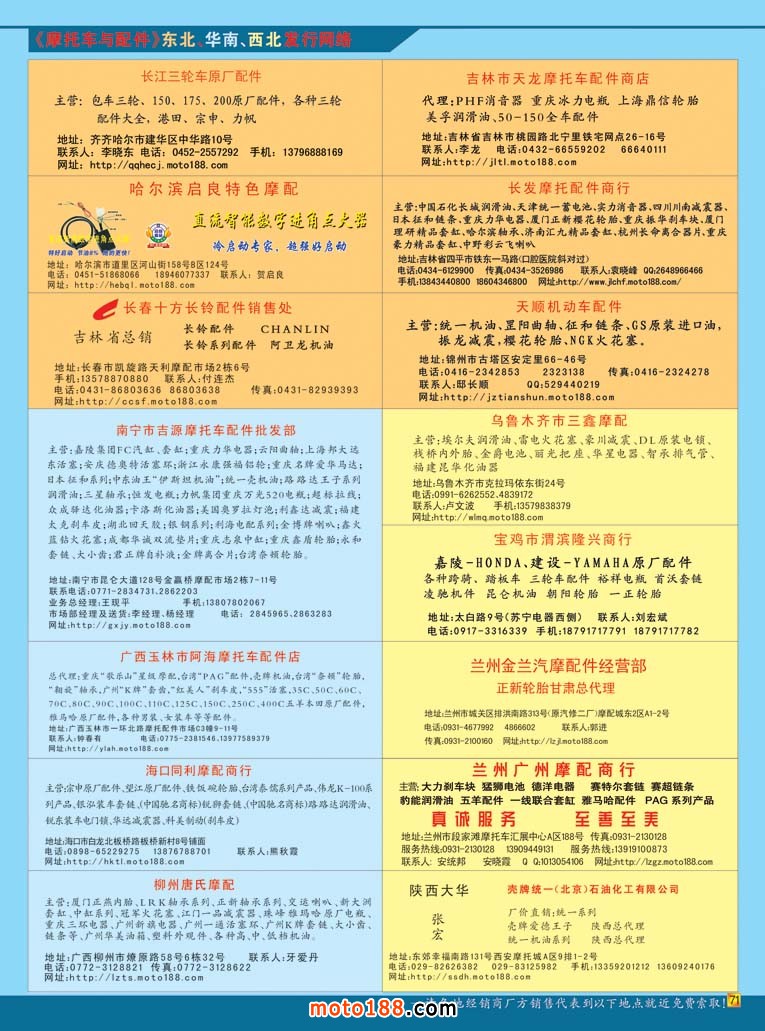 新版《中國摩托車配件市場指南·華南版》首發(fā),廣州地區(qū)用中英文雙語出版,為外商使用此書提供便利。明年上半年全摩會在重慶召開,新版《中國摩托車市場指南·川渝版》廣告征集工作也已經(jīng)開展,此書將在明年