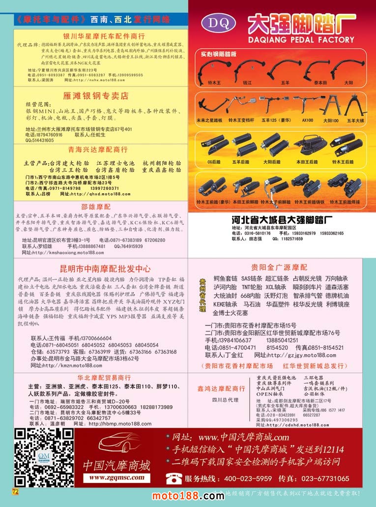 新版《中國摩托車配件市場指南·華南版》首發(fā),廣州地區(qū)用中英文雙語出版,為外商使用此書提供便利。明年上半年全摩會在重慶召開,新版《中國摩托車市場指南·川渝版》廣告征集工作也已經(jīng)開展,此書將在明年