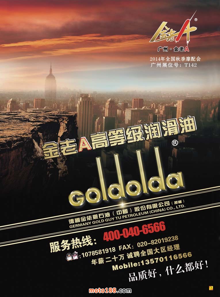 行業(yè)大型展會——第三十四屆秋季廣州全摩會會展期間,由于雜志廣告版面較多,原定出版的配件套缸專題和三輪車行業(yè)的相關(guān)信息專題移至下期出刊。