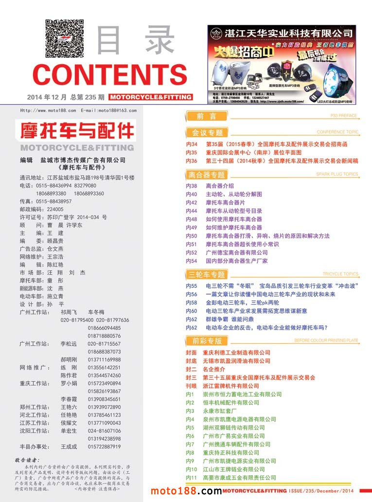 天氣在漸漸變冷,時令將進(jìn)入冬季,對于南方市場來說,將迎來元旦、春節(jié)的節(jié)日市場,并達(dá)到新年銷售的高潮;對于北方市場來說,冬季則將步入淡季。對我們雜志社來說,冬季也將了收官階段,開始規(guī)劃新一年的工作,凡事預(yù)則立,不預(yù)則廢。為了明年更好的開展工作,我們雜志社規(guī)劃在2015年的工作分三條線開展:一是為了2015年的春季重慶全國摩托車及配件展示交易會的召開編寫新版的《西南(川渝)市場指南》,明年上半年的配件行業(yè)的工作重點(diǎn)放置在西南地區(qū);春季重慶全摩會也涉及新能源行業(yè),我們雜志也將為這一專題做好相應(yīng)的工作。二是在2014年我們雜志社參與了很多的在電動車、三輪車行業(yè)的會議,頻率大概是每月參加4次會議,同時增加了重點(diǎn)市場的投放,但是工作進(jìn)展卻不盡人意,在明年的工作中我們將會增加這一塊的投入,加大工作力度;同時把這個行業(yè)大數(shù)據(jù)進(jìn)行整理匯總,初步統(tǒng)計有5~7萬家的資料需要核對,由于工作量巨大,此項工作目前已經(jīng)開始進(jìn)行。三是我們今年新出刊的《新能源車》雜志,明年將以月刊的形式出刊,同時在全國有新能源汽車的市場做到全覆蓋,除了做到最好之外,把同行甩得更遠(yuǎn)。