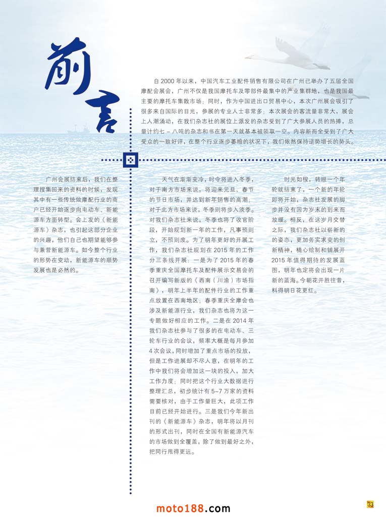 天氣在漸漸變冷,時令將進入冬季,對于南方市場來說,將迎來元旦、春節(jié)的節(jié)日市場,并達(dá)到新年銷售的高潮;對于北方市場來說,冬季則將步入淡季。對我們雜志社來說,冬季也將了收官階段,開始規(guī)劃新一年的工作,凡事預(yù)則立,不預(yù)則廢。為了明年更好的開展工作,我們雜志社規(guī)劃在2015年的工作分三條線開展:一是為了2015年的春季重慶全國摩托車及配件展示交易會的召開編寫新版的《西南(川渝)市場指南》,明年上半年的配件行業(yè)的工作重點放置在西南地區(qū);春季重慶全摩會也涉及新能源行業(yè),我們雜志也將為這一專題做好相應(yīng)的工作。二是在2014年我們雜志社參與了很多的在電動車、三輪車行業(yè)的會議,頻率大概是每月參加4次會議,同時增加了重點市場的投放,但是工作進展卻不盡人意,在明年的工作中我們將會增加這一塊的投入,加大工作力度;同時把這個行業(yè)大數(shù)據(jù)進行整理匯總,初步統(tǒng)計有5~7萬家的資料需要核對,由于工作量巨大,此項工作目前已經(jīng)開始進行。三是我們今年新出刊的《新能源車》雜志,明年將以月刊的形式出刊,同時在全國有新能源汽車的市場做到全覆蓋,除了做到最好之外,把同行甩得更遠(yuǎn)。