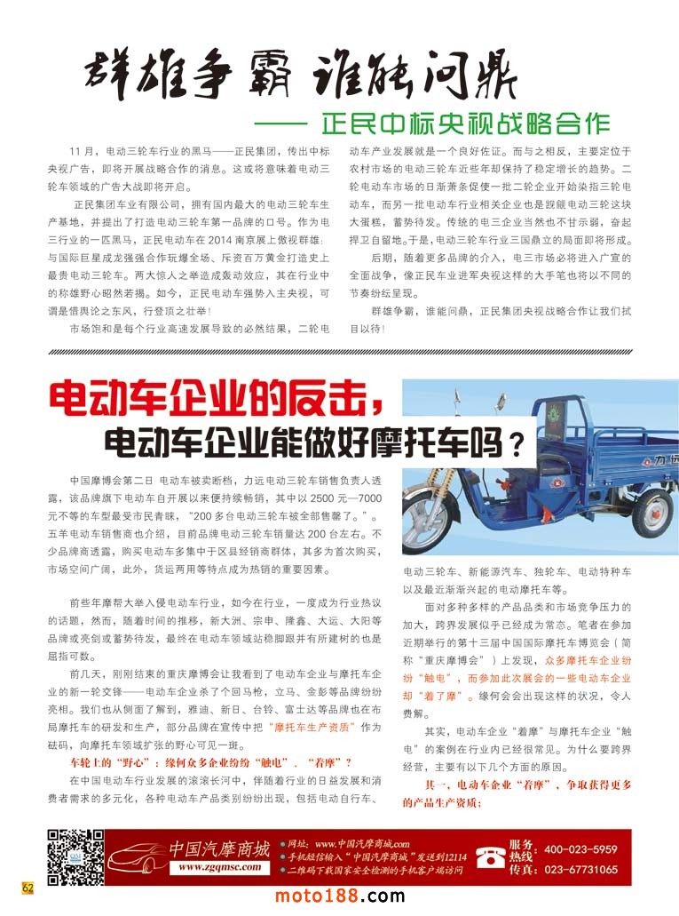 天氣在漸漸變冷,時令將進(jìn)入冬季,對于南方市場來說,將迎來元旦、春節(jié)的節(jié)日市場,并達(dá)到新年銷售的高潮;對于北方市場來說,冬季則將步入淡季。對我們雜志社來說,冬季也將了收官階段,開始規(guī)劃新一年的工作,凡事預(yù)則立,不預(yù)則廢。為了明年更好的開展工作,我們雜志社規(guī)劃在2015年的工作分三條線開展:一是為了2015年的春季重慶全國摩托車及配件展示交易會的召開編寫新版的《西南(川渝)市場指南》,明年上半年的配件行業(yè)的工作重點放置在西南地區(qū);春季重慶全摩會也涉及新能源行業(yè),我們雜志也將為這一專題做好相應(yīng)的工作。二是在2014年我們雜志社參與了很多的在電動車、三輪車行業(yè)的會議,頻率大概是每月參加4次會議,同時增加了重點市場的投放,但是工作進(jìn)展卻不盡人意,在明年的工作中我們將會增加這一塊的投入,加大工作力度;同時把這個行業(yè)大數(shù)據(jù)進(jìn)行整理匯總,初步統(tǒng)計有5~7萬家的資料需要核對,由于工作量巨大,此項工作目前已經(jīng)開始進(jìn)行。三是我們今年新出刊的《新能源車》雜志,明年將以月刊的形式出刊,同時在全國有新能源汽車的市場做到全覆蓋,除了做到最好之外,把同行甩得更遠(yuǎn)。