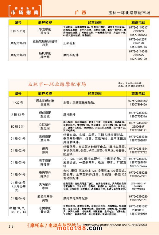 內(nèi)216 玉林市一環(huán)北路摩配市場經(jīng)銷商名錄