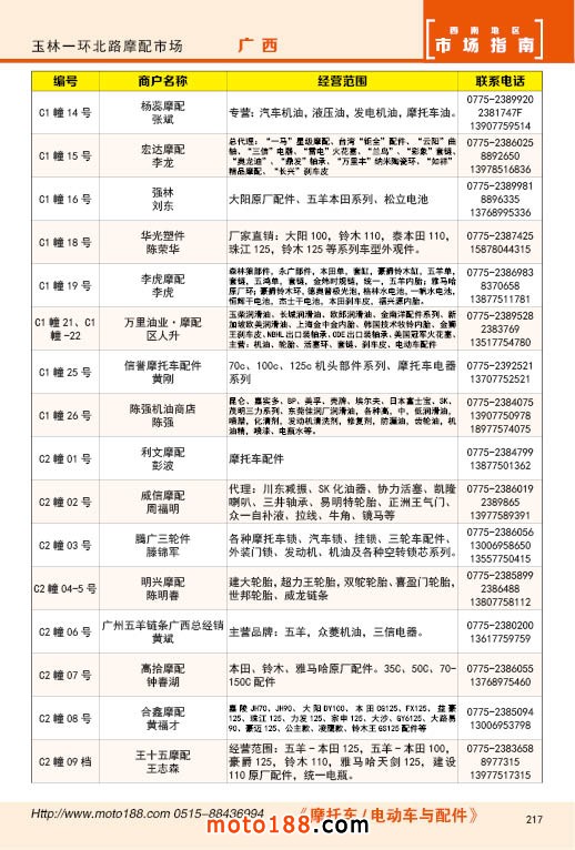 內(nèi)217 玉林市一環(huán)北路摩配市場經(jīng)銷商名錄