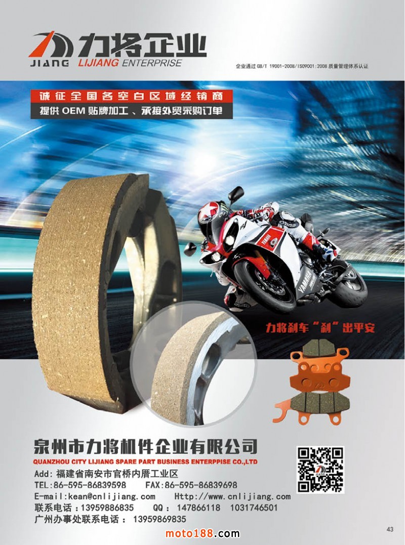 今年第四期雜志雖然在全國(guó)市場(chǎng)都有發(fā)行,一些不在市場(chǎng)的地區(qū)商戶(hù)除了通過(guò)www.moto188.com網(wǎng)站閱讀,也可到我們展位直接領(lǐng)取。由于本期雜志需要宣傳的企業(yè)較多,原來(lái)的摩托車(chē)及電動(dòng)車(chē)行業(yè)的資訊的內(nèi)容,順延到下一期發(fā)布。