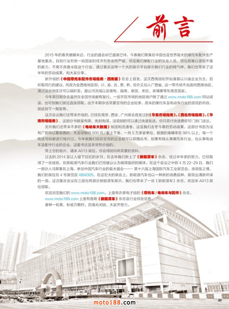 今年第四期雜志雖然在全國(guó)市場(chǎng)都有發(fā)行,一些不在市場(chǎng)的地區(qū)商戶除了通過(guò)www.moto188.com網(wǎng)站閱讀,也可到我們展位直接領(lǐng)取。由于本期雜志需要宣傳的企業(yè)較多,原來(lái)的摩托車及電動(dòng)車行業(yè)的資訊的內(nèi)容,順延到下一期發(fā)布。