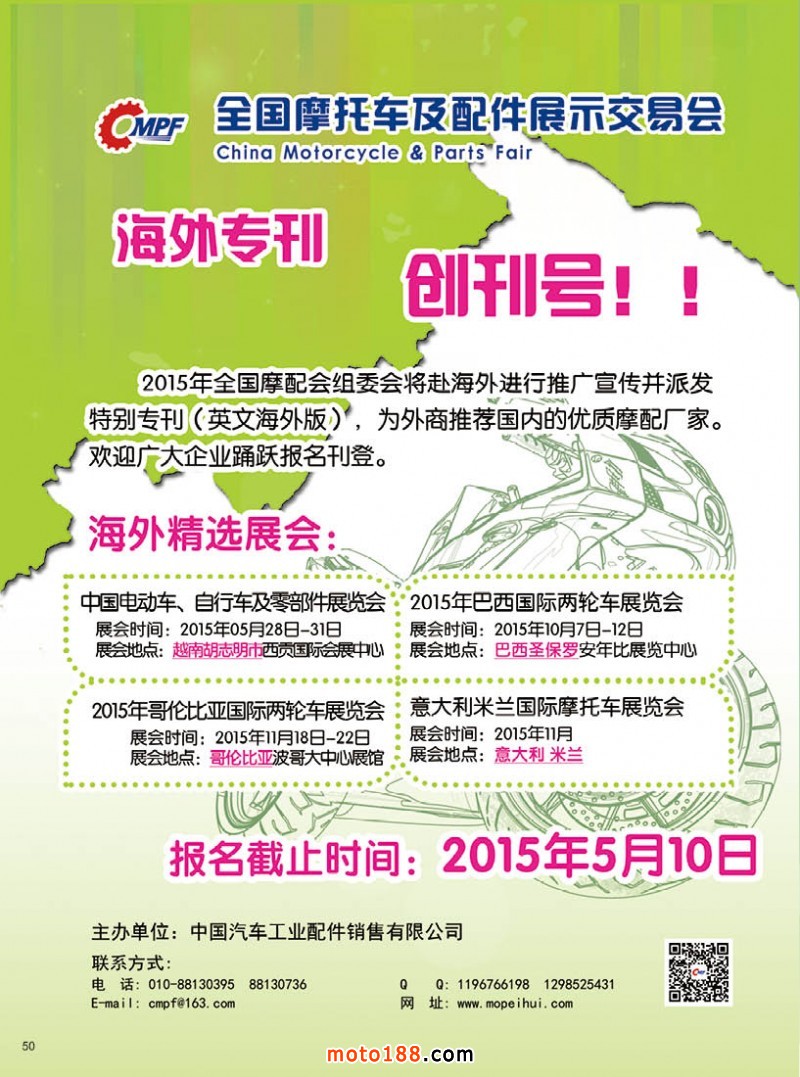 今年第四期雜志雖然在全國(guó)市場(chǎng)都有發(fā)行,一些不在市場(chǎng)的地區(qū)商戶(hù)除了通過(guò)www.moto188.com網(wǎng)站閱讀,也可到我們展位直接領(lǐng)取。由于本期雜志需要宣傳的企業(yè)較多,原來(lái)的摩托車(chē)及電動(dòng)車(chē)行業(yè)的資訊的內(nèi)容,順延到下一期發(fā)布。