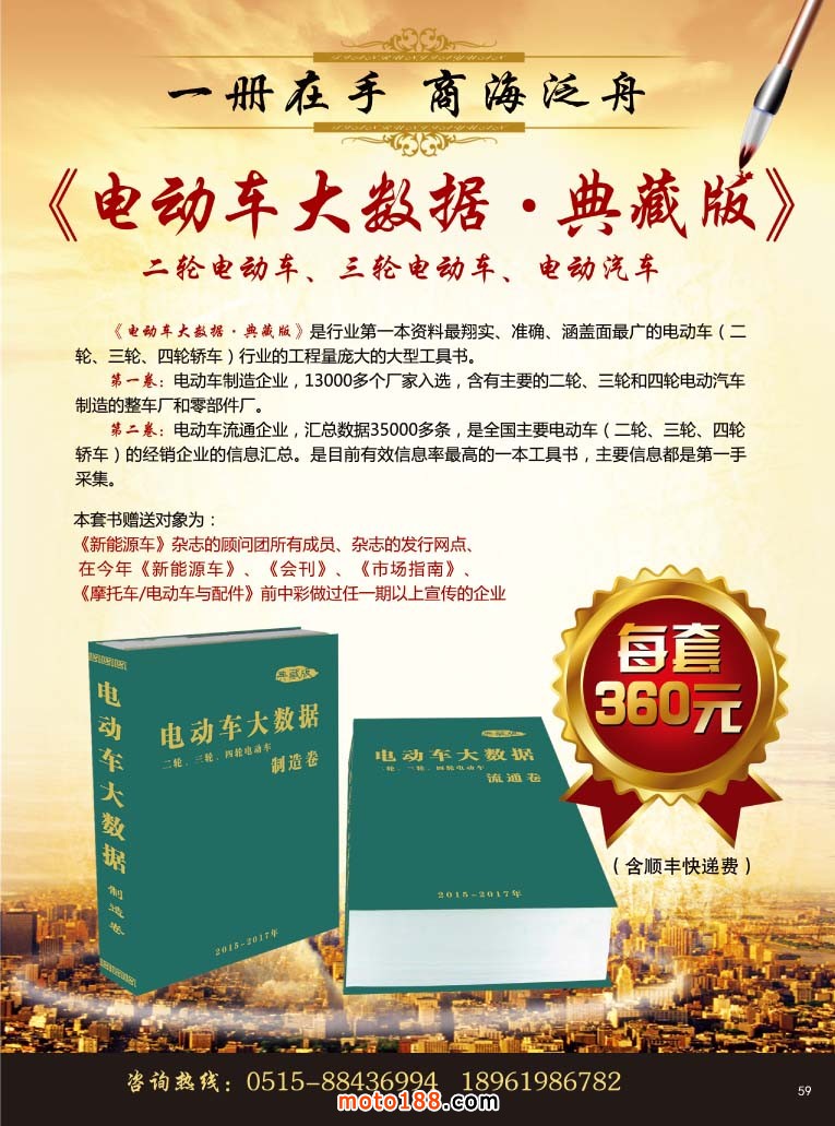 為了感謝行業(yè)同仁的支持和信任,今年初編輯《電動車大數(shù)據(jù)》一套兩本的電動車數(shù)據(jù)庫工具書,將贈送給今年在我們雜志和書上做廣告宣傳的企業(yè),我們在各個市場的發(fā)行代理,有既經(jīng)營摩托車又做電動車配件的企業(yè)請和我們聯(lián)系,我們安排發(fā)送。