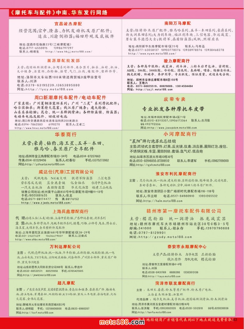 第二次《指南》升級(jí)版的最后一個(gè)版本《北方市場(chǎng)指南》將在明年春季哈爾濱全摩會(huì)上首發(fā),本版《北方市場(chǎng)指南》收集了河北省、山西省、內(nèi)蒙古、北京市、天津市、遼寧省、吉林省、黑龍江省8省市的市場(chǎng)資料,希望所在地區(qū)的企業(yè)向我們提供你們的最新資料,免費(fèi)收錄在書中,我們也將組織人員去市場(chǎng)第一線采集信息,廣告版面預(yù)訂也從現(xiàn)在正式開始。