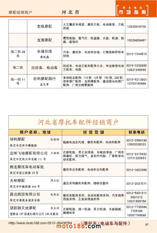 中國摩配市場從上世紀九十年代開始經(jīng)過高速度的發(fā)展,正逐步減速,摩托車行業(yè)也漸呈式微,與之緊密相關(guān)的后市場的配件與維修也呈逐步下滑之勢,取代摩托車的在發(fā)達地區(qū)是汽車,欠發(fā)達地區(qū)是電動兩輪、電動三輪,甚至電動四輪車,隨著經(jīng)濟的發(fā)展,出行的多樣化,也給了消費者多重的選擇。目前現(xiàn)有的摩托車及配件市場,也不再是以純摩托車為主體,有的市場電動車取代了摩托車,有的商店也是混合經(jīng)營,這些變化在《市場指南》里面都有所反應(yīng)。這次《北方指南》一些小市場不再單列,并入到相應(yīng)的省份中去;以前去市場的公交線路,書中也不再列入,因為現(xiàn)在的地圖導(dǎo)航功能十分強大,既新又準。