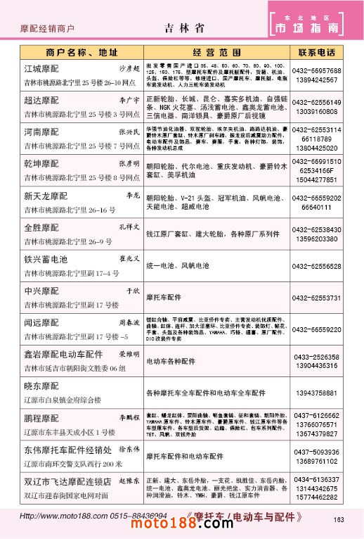 中國摩配市場從上世紀九十年代開始經(jīng)過高速度的發(fā)展,正逐步減速,摩托車行業(yè)也漸呈式微,與之緊密相關(guān)的后市場的配件與維修也呈逐步下滑之勢,取代摩托車的在發(fā)達地區(qū)是汽車,欠發(fā)達地區(qū)是電動兩輪、電動三輪,甚至電動四輪車,隨著經(jīng)濟的發(fā)展,出行的多樣化,也給了消費者多重的選擇。目前現(xiàn)有的摩托車及配件市場,也不再是以純摩托車為主體,有的市場電動車取代了摩托車,有的商店也是混合經(jīng)營,這些變化在《市場指南》里面都有所反應。這次《北方指南》一些小市場不再單列,并入到相應的省份中去;以前去市場的公交線路,書中也不再列入,因為現(xiàn)在的地圖導航功能十分強大,既新又準。
