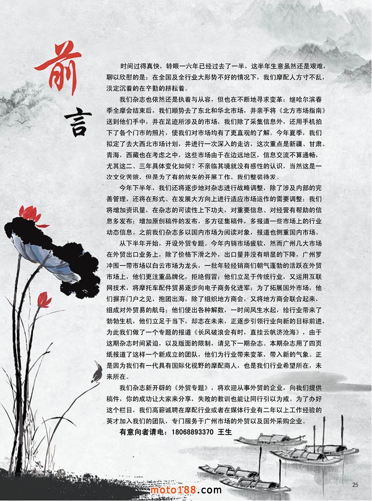 從下半年開始,開設外貿專題。今年內銷市場疲軟,然而廣州幾大市場在外貿出口業(yè)務上,除了價格下滑之外,出口量并沒有明顯的下降,廣州羅沖圍一帶市場以白云市場為龍頭,一批年輕經銷商們朝氣蓬勃的活躍在外貿市場上,他們更注重品牌化,拒絕假冒;他們立足于傳統(tǒng)行業(yè),又運用互聯(lián)網技術,將摩托車配件貿易逐步向電子商務化進軍;為了拓展國外市場,他們摒棄門戶之見,抱團出海,除了組織地方商會,又將地方商會聯(lián)合起來,組成對外貿易的航母;他們使出各種解數,一時間風生水起,給行業(yè)帶來了勃勃生機,他們立足于當下,卻志在未來,正逐步引領行業(yè)向新的目標前進,為此我們做了一個專題的報道《長風破浪會有時,直掛云帆濟滄?!?,由于這期雜志時間緊迫,以及版面的限制,請見下一期雜志。本期雜志用了四頁紙報道了這樣一個新成立的團隊,他們?yōu)樾袠I(yè)帶來變革,帶入新的氣象。正是因為我們有一代具有國際化視野的摩配商人,也是我們行業(yè)希望所在,未來所在。