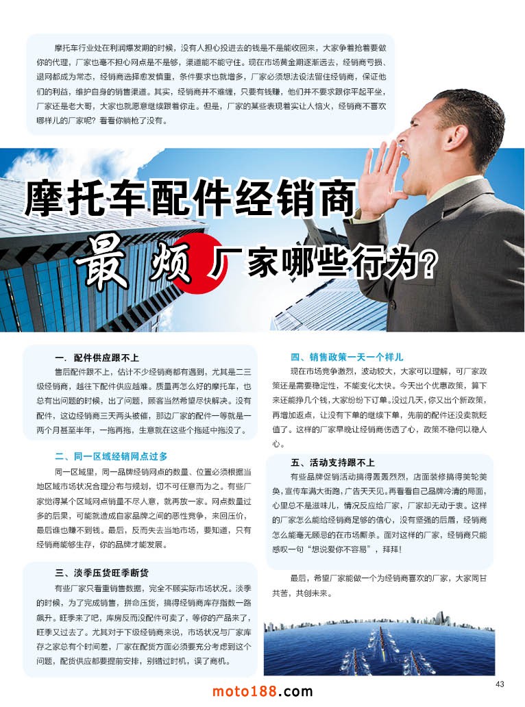我們正一步步地穩(wěn)妥的按照既定的計(jì)劃實(shí)施,同時(shí)努力發(fā)現(xiàn)和捕捉新的商機(jī),隨時(shí)進(jìn)行調(diào)整,下一期雜志就是在廣州全摩會(huì)上投放的,我們要突出外貿(mào)的主體和重點(diǎn),從此后所有的廣告宣傳都采用中英文雙語出刊。由于內(nèi)銷市場(chǎng)不景氣,摩托車配件的主要出處還是國際市場(chǎng),目前我們已經(jīng)在有行業(yè)半壁江山之稱的廣州加強(qiáng)了發(fā)行工作,做到全覆蓋,由于廣州市場(chǎng)駐點(diǎn)采購的外商較多,雙語出刊后,不僅方便他們閱讀,明年還將走出國門去國外市場(chǎng)推廣,同時(shí)結(jié)合互聯(lián)網(wǎng)技術(shù),將雜志立體化的推進(jìn)。