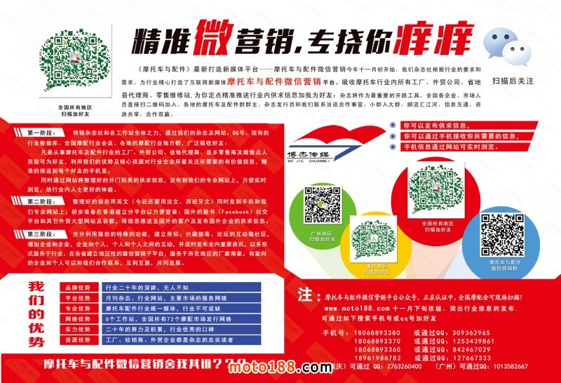 雜志將作為摩托車與配件微信營銷平臺的最重要的開路工具,全國各企業(yè)、市場人員可直接掃二維碼加入。展會期間歡迎各位光臨4092展位,掃二維碼領取雜志和《華南市場指南》。