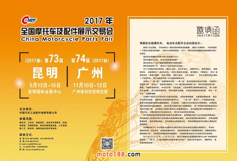 今年第73屆全國(guó)摩托車(chē)及配件展示交易會(huì)將在昆明召開(kāi),目前我們正在為會(huì)議進(jìn)行緊張的忙碌中。今年在會(huì)議上我們提供的資料是《西南地區(qū)市場(chǎng)指南》《會(huì)刊》《摩托車(chē)與配件》第五期雜志,歡迎大家到6130展位來(lái)領(lǐng)取。