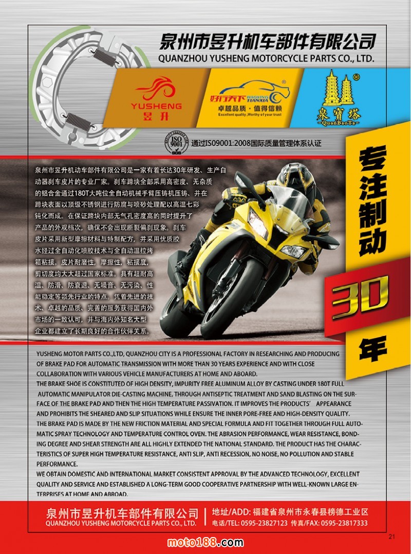 2017.6月《摩托車/電動(dòng)車與配件》雜志,歡迎大家閱讀日期:2017-06-02 點(diǎn)擊:1297 查看原圖 全部展開![]() ![]() ![]() 內(nèi)21 泉州市昱升機(jī)車部件有限公司